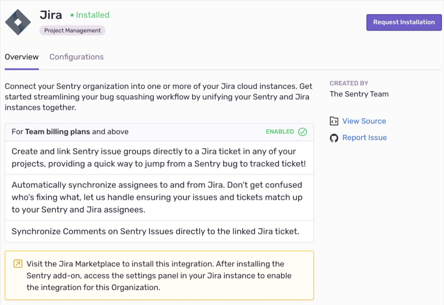 In Sentry, you’ll see a new Jira instance appear on the Integrations page.